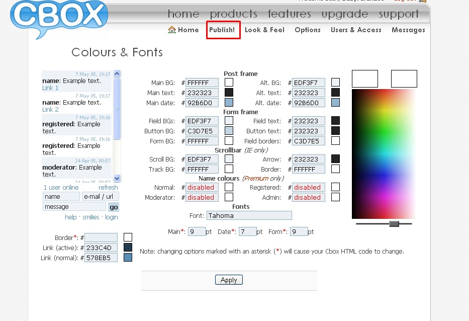 dashboard>design>add a gadget>paste code cbox>save
